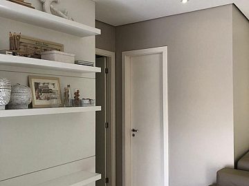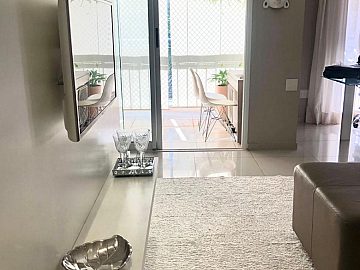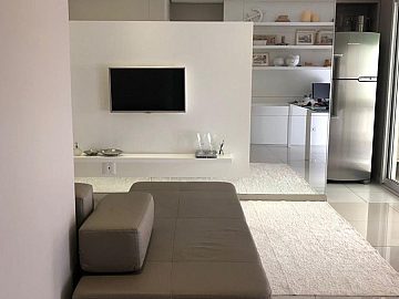 O imóvel conta com 1 suíte + banheiro social, sala ampla com layout versátil (office), cozinha integrada à área de serviço e sacada com churrasqueira. Totalmente mobiliado, com decoração atemporal, eletrodomésticos, utensílios, ar-condicionado split, iluminação em LED, ótima ventilação e excelente iluminação natural.